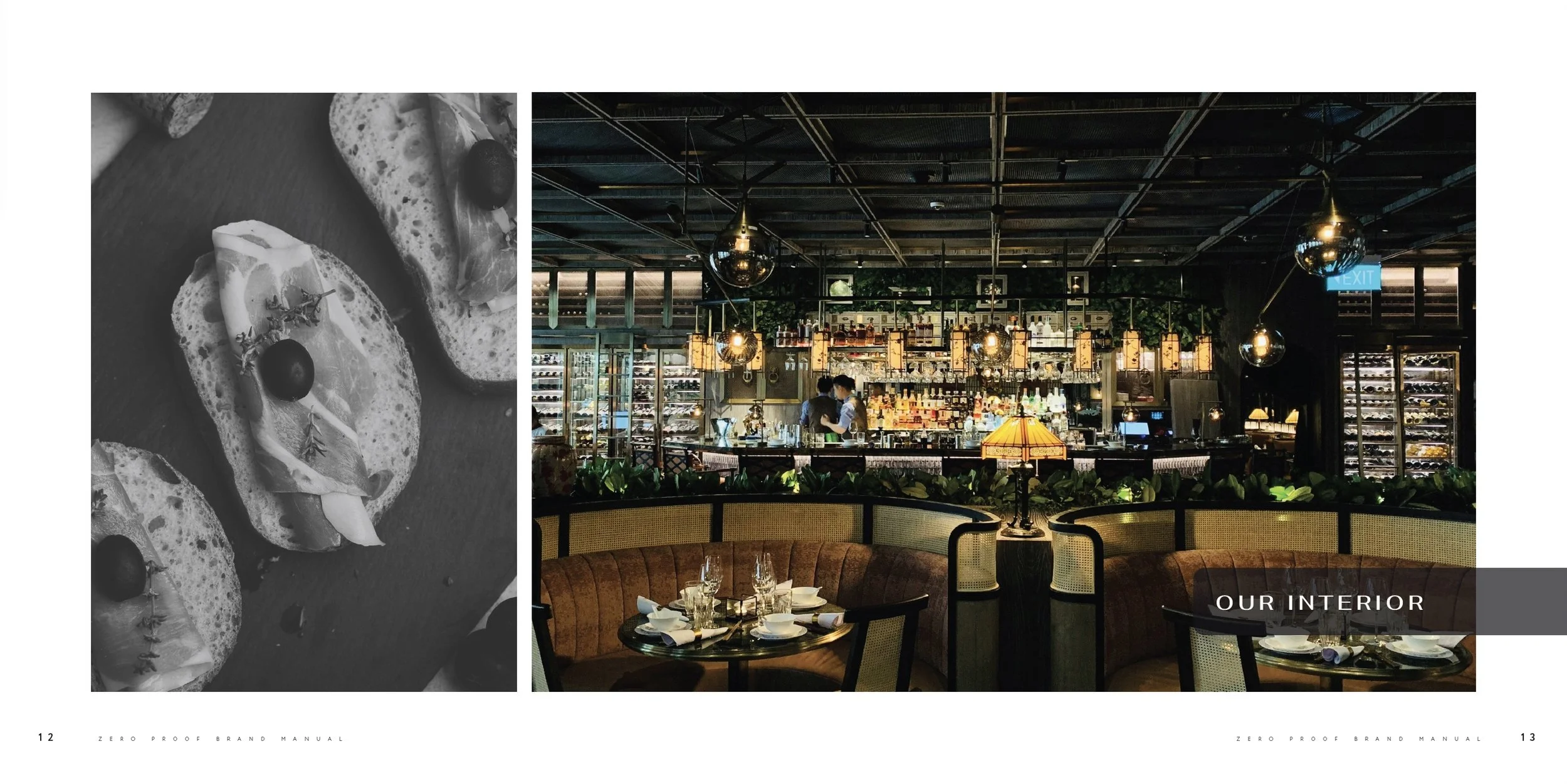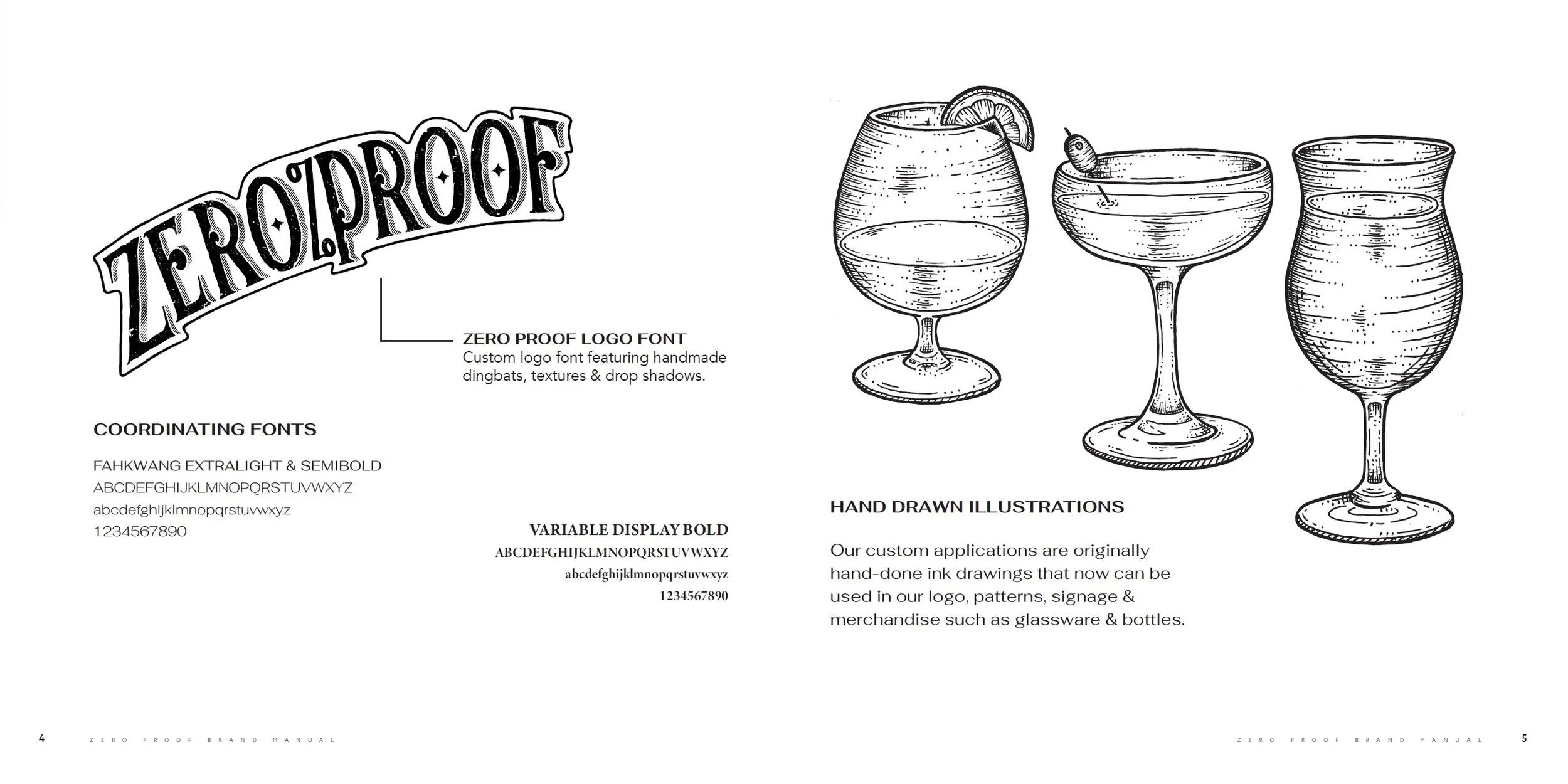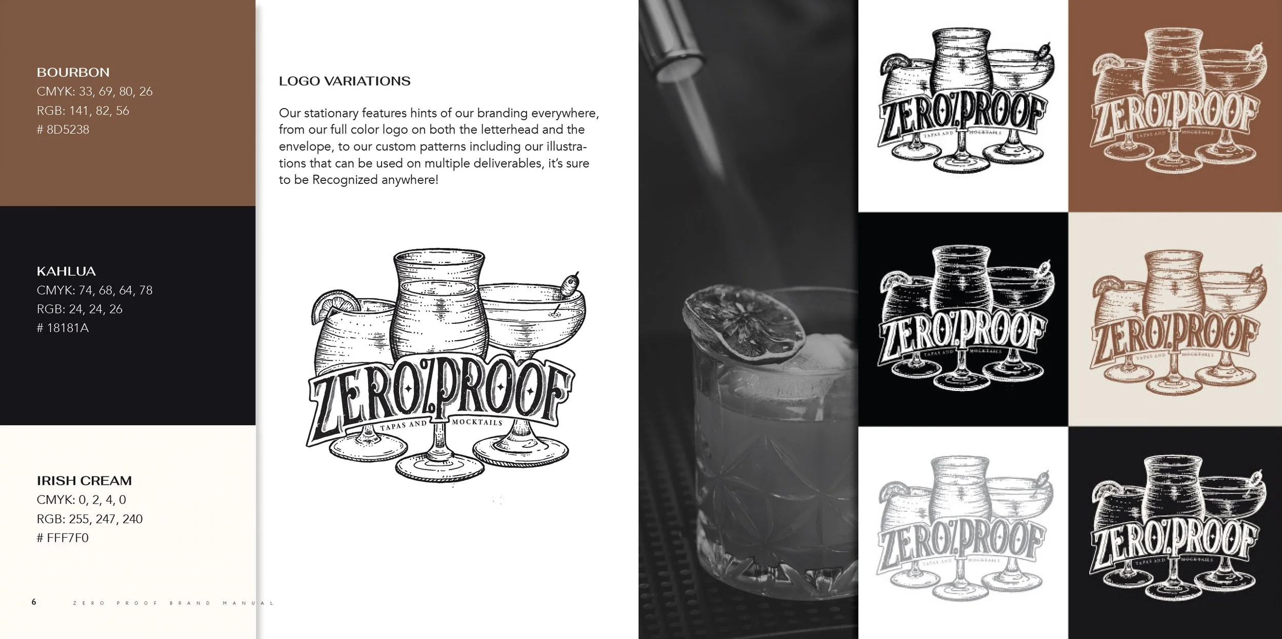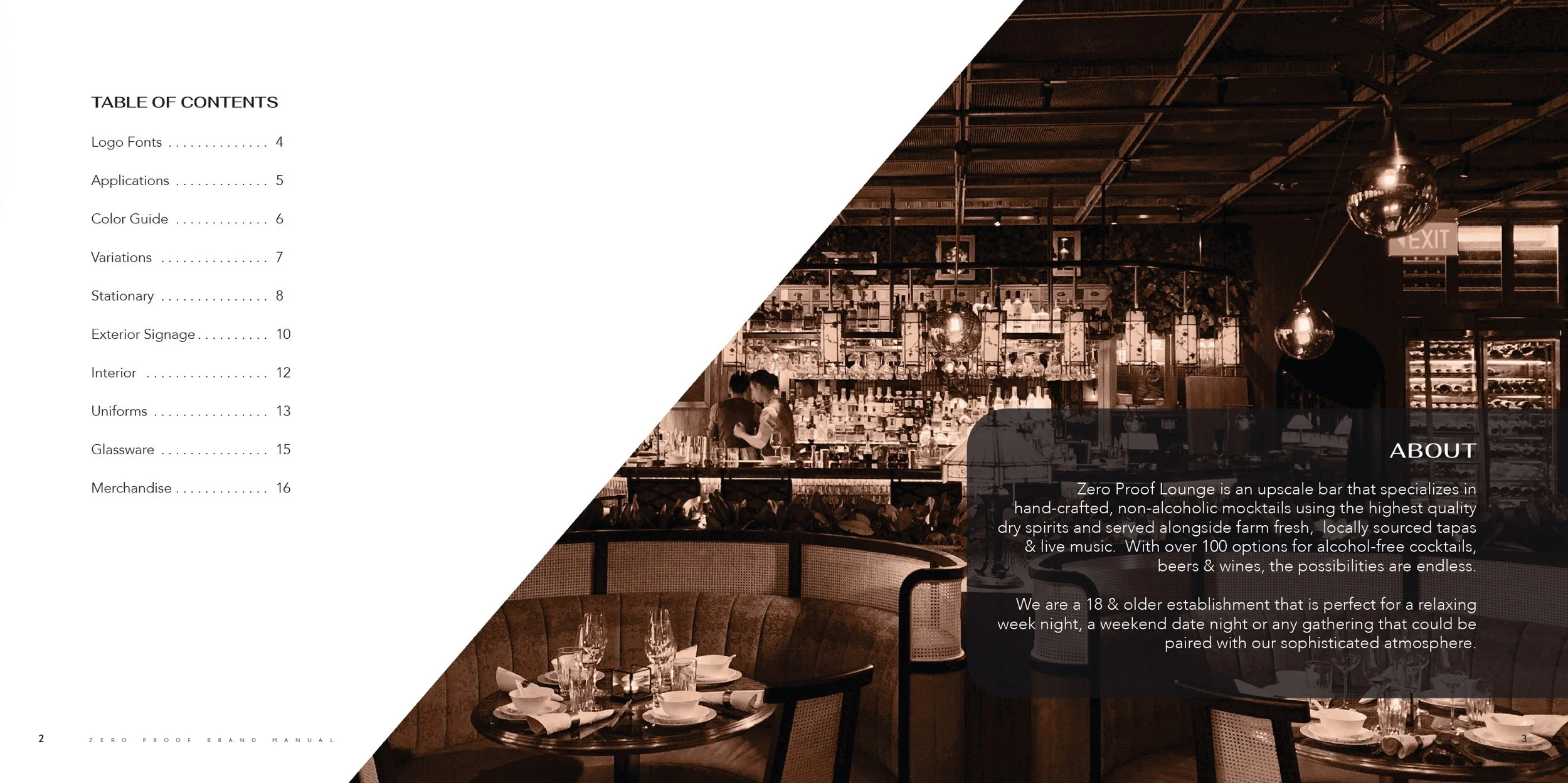 Zero Proof is the place for you. This bar and lounge has a large assortment of non-alcoholic spirits and a wide array of tapas, ready for you to enjoy. I created hand done type and illustrations to bring back that classic speakeasy feel, and paired it with the moody, warm-toned palette to give it a sophisticated look.